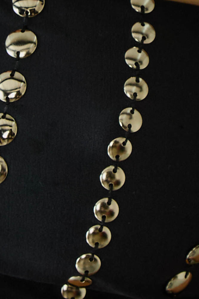As tachas aplicadas ao tecido criam um efeito visual de listras marcadas, adicionando uma textura rica e um brilho sutil que eleva o biquíni a um item de moda resort.