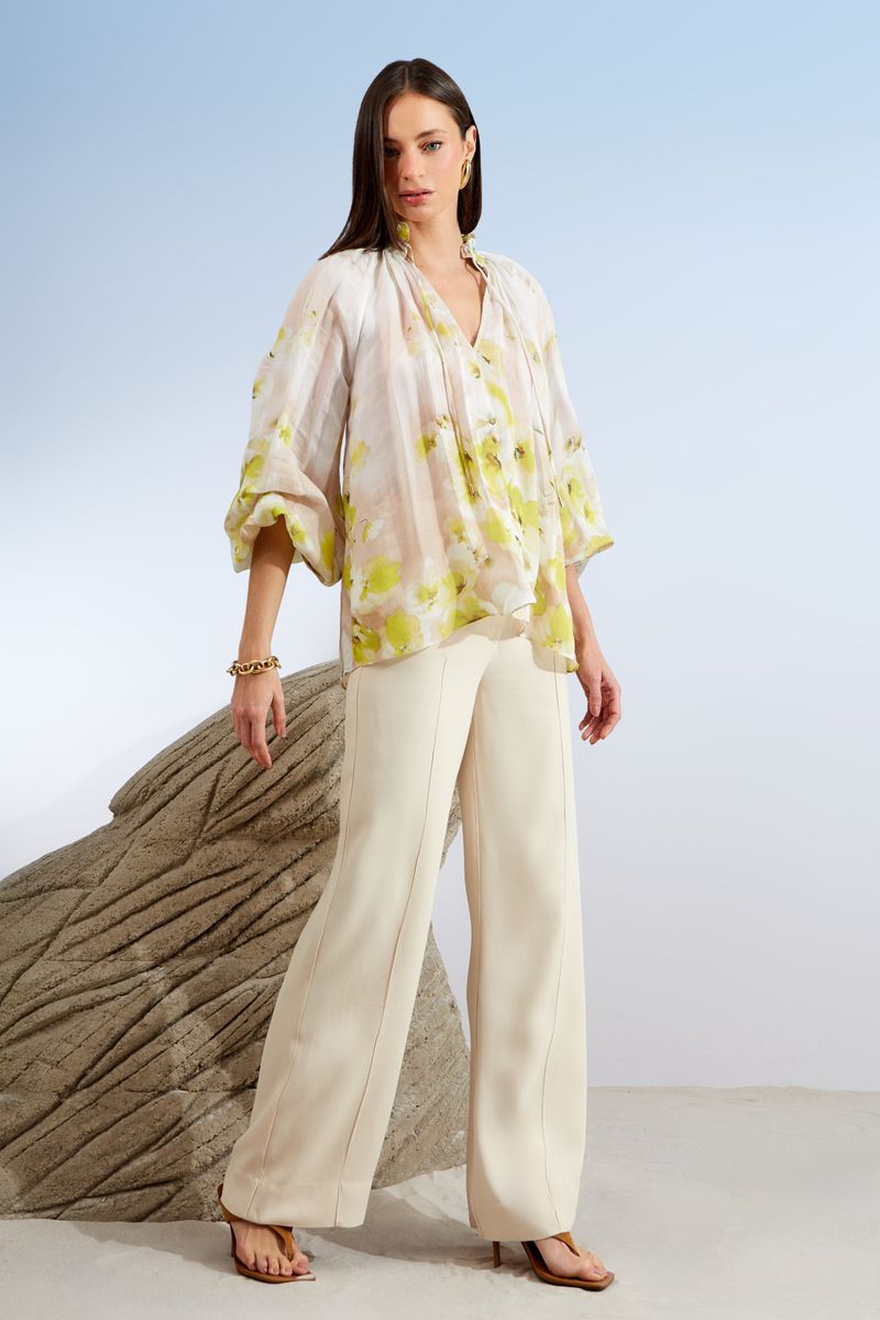 Blusa com estampa floral em tons de offwhite, amarelo e verde, em tecido misto com linho. Modelo com mangas amplas e detalhe de amarração na gola.