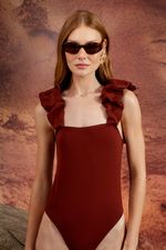 Body marrom confeccionado em jersey. Modelagem com alças de babado em nível e decote reto. Peça não adequada para banho, evite contato com água do mar, piscina ou cachoeira.