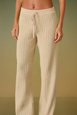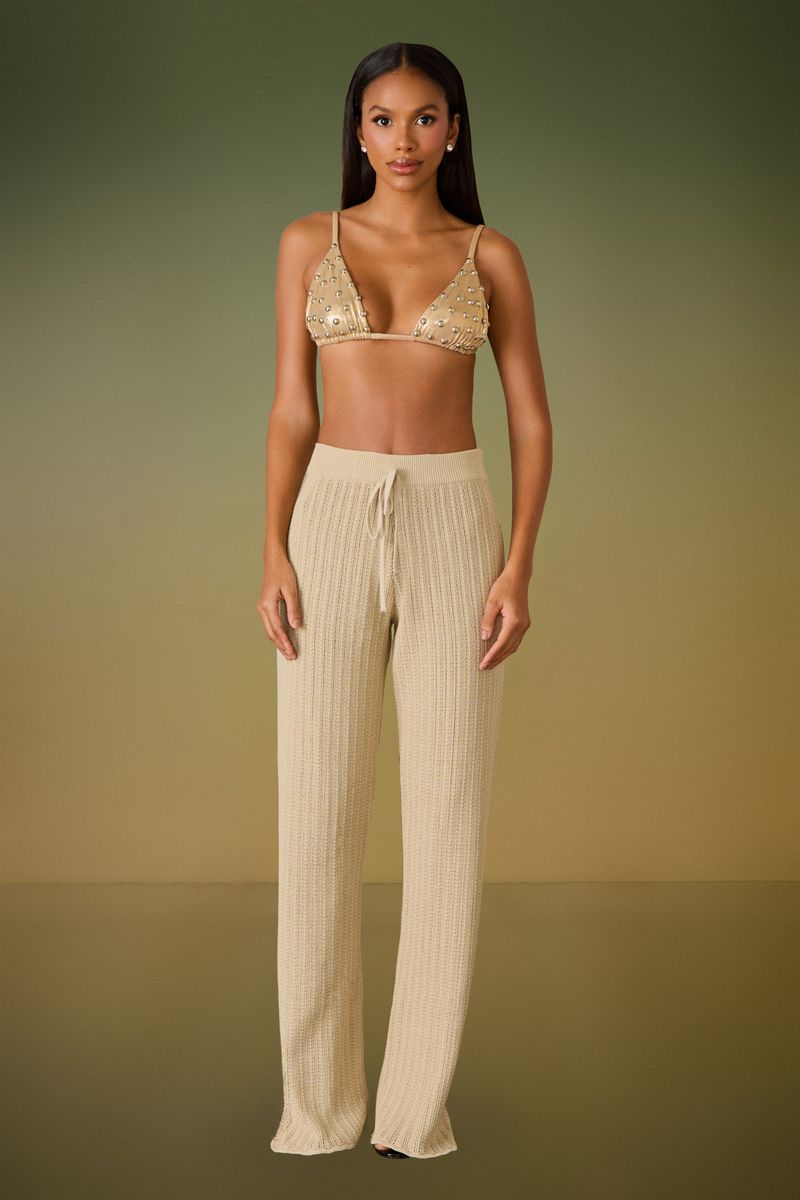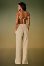 Calça confecciona em tricot. Modelagem em pantalona, cintura alta e rolotê com ponteiras em metal.
