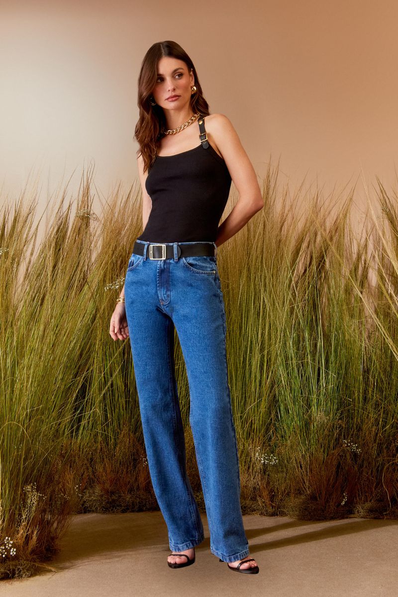 Calça jeans com lavagem média. Modelo reto e clássico com cós largo, passantes, bolsos frontais e posteriores, pala e fechamento frontal por zíper e botão.