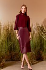 Saia midi em couro bordô. Modelagem reta, justa ao corpo, com barrado largo. A peça traz cós médio e fechamento posterior por zíper.