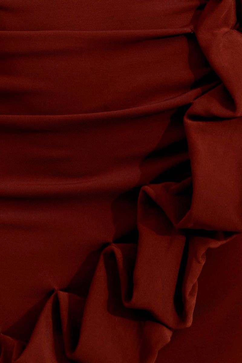 Vestido curto marrom desenvolvido em jersey. Modelo tomara que caia, ajustado ao corpo com babado nuvem na diagonal da saia. A cintura recebe franzido que se estende às costas. Fechamento posterior por zíper.