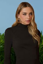 A gola alta, aliada às mangas longas, confere ao vestido um ar de refinamento e modernidade. Este design é perfeito para ocasiões que exigem um visual mais formal, equilibrando sensualidade e sobriedade. A escolha ideal para quem busca se destacar com elegância discreta.