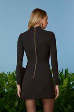 Vestido curto preto confeccionado em tecido de crepe estruturado. Possui shape justo ao corpo, gola alta, mangas longas e detalhe sofisticado na lateral da saia em organza de seda pura.