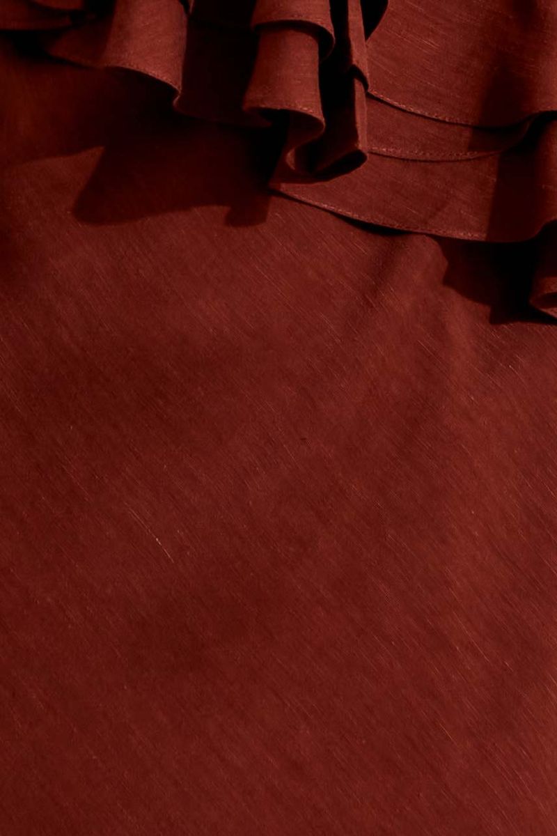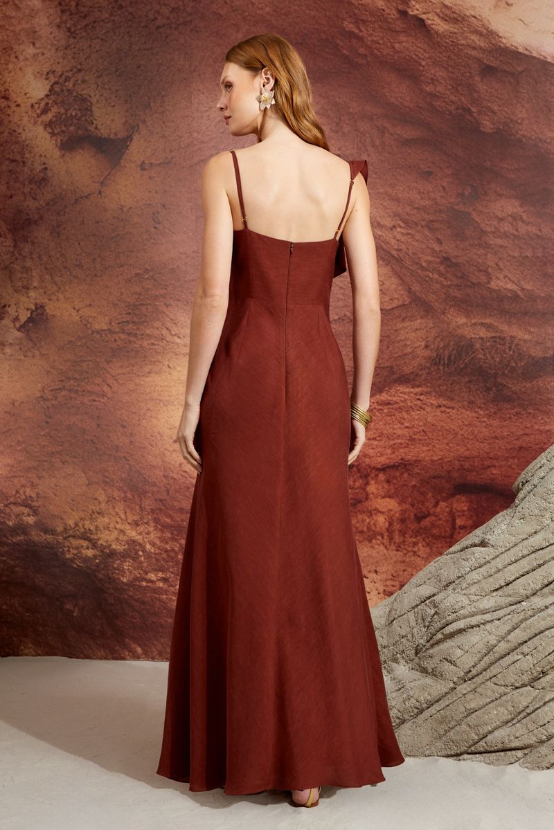 Vestido longo marrom confeccionado em tecido misto com linho. Modelagem ajustada com uma alça fina, babados cruzados no decote V que se estendem para um dos ombros. Fechamento posterior por zíper.