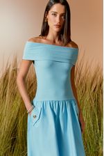 Vestido midi azul claro confeccionado em mix de tecidos. Modelo ombro a ombro com blusa em malha premium e saia ampla com bolsos em tricoline.