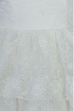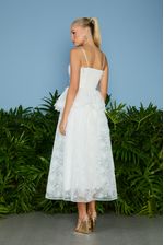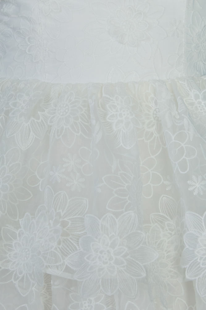 Vestido midi off white confeccionado em organza com flores em 3D. Possui alças finas, decote reto, peplum, saia godê e lastex nas costas. Fechamento posterior por zíper.